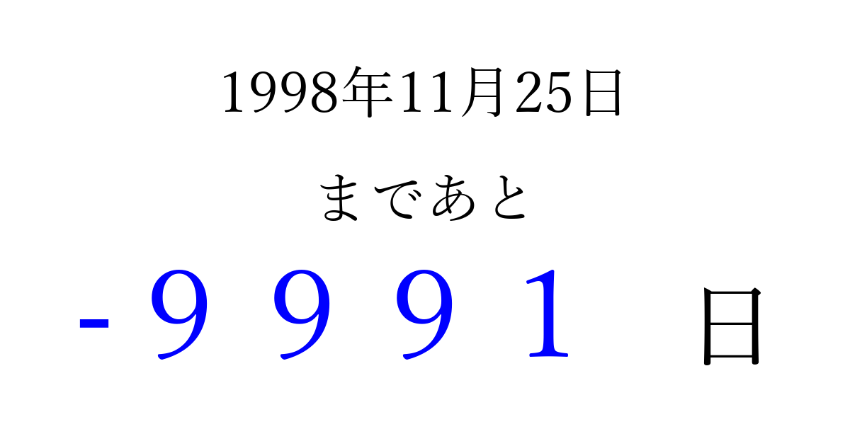1998年11月25日(水)は もう 0000 日過ぎました 追加すると、トップページからすぐ選べるようになります ※2026/04/03現在の結果です。 最新の状態に更新する ↓シェアして、タイムライン上にカウントダウンを表示しよう!↓ 📤 この結果を共有する Tweet シェア Threads Bluesky 別の日付でカウントダウン 1998年11月のカレンダー このページをブックマークに追加すると、いつでもカウントダウンを確認できます。 (PC: Ctrl+D / Mac: ⌘+D) hitome-notes.comでは以下のページも運営しています。 指定日と期間から日付を計算 | ガチャ確率計算・シミュレーション | プライバシー・ポリシー 運営者:Avocado