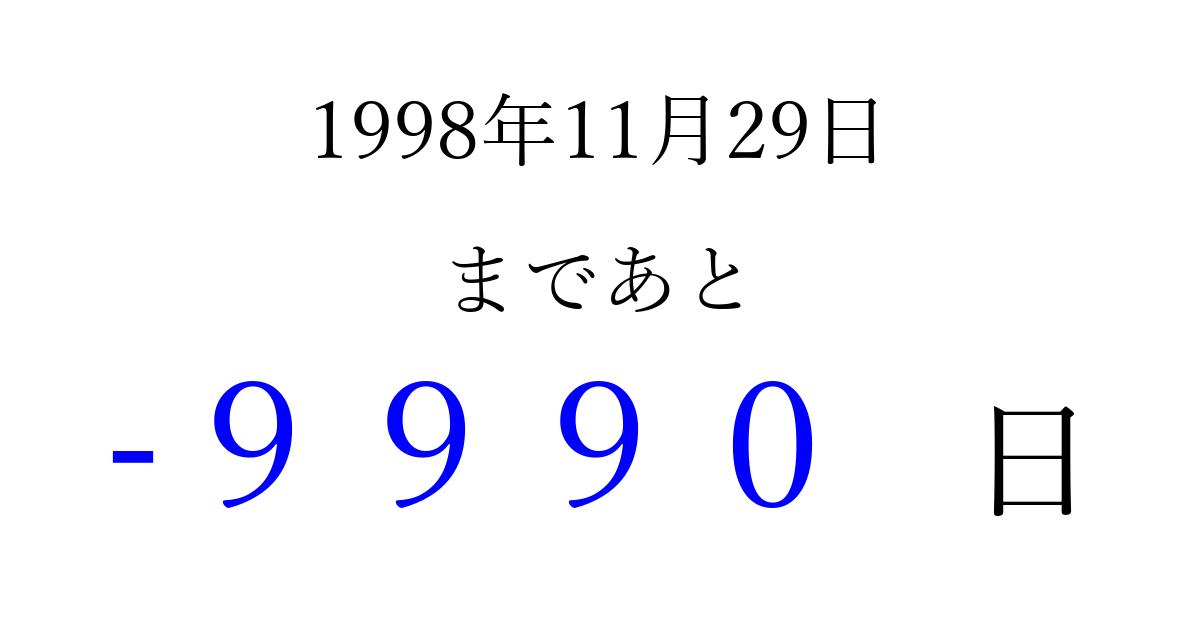 1998年11月29日(日)は もう 0000 日過ぎました 追加すると、トップページからすぐ選べるようになります ※2026/04/06現在の結果です。 最新の状態に更新する ↓シェアして、タイムライン上にカウントダウンを表示しよう!↓ 📤 この結果を共有する Tweet シェア Threads Bluesky 別の日付でカウントダウン 1998年11月のカレンダー このページをブックマークに追加すると、いつでもカウントダウンを確認できます。 (PC: Ctrl+D / Mac: ⌘+D) hitome-notes.comでは以下のページも運営しています。 指定日と期間から日付を計算 | ガチャ確率計算・シミュレーション | プライバシー・ポリシー 運営者:Avocado