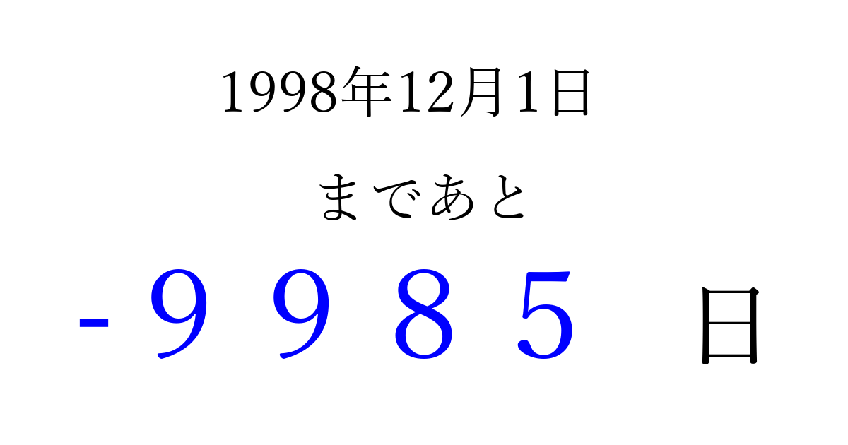 1998年12月1日(火)は もう 0000 日過ぎました 追加すると、トップページからすぐ選べるようになります ※2026/04/03現在の結果です。 最新の状態に更新する ↓シェアして、タイムライン上にカウントダウンを表示しよう!↓ 📤 この結果を共有する Tweet シェア Threads Bluesky 別の日付でカウントダウン 1998年12月のカレンダー このページをブックマークに追加すると、いつでもカウントダウンを確認できます。 (PC: Ctrl+D / Mac: ⌘+D) hitome-notes.comでは以下のページも運営しています。 指定日と期間から日付を計算 | ガチャ確率計算・シミュレーション | プライバシー・ポリシー 運営者:Avocado