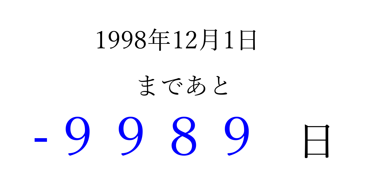 1998年12月1日(火)は もう 0000 日過ぎました 追加すると、トップページからすぐ選べるようになります ※2026/04/07現在の結果です。 最新の状態に更新する ↓シェアして、タイムライン上にカウントダウンを表示しよう!↓ 📤 この結果を共有する Tweet シェア Threads Bluesky 別の日付でカウントダウン 1998年12月のカレンダー このページをブックマークに追加すると、いつでもカウントダウンを確認できます。 (PC: Ctrl+D / Mac: ⌘+D) hitome-notes.comでは以下のページも運営しています。 指定日と期間から日付を計算 | ガチャ確率計算・シミュレーション | プライバシー・ポリシー 運営者:Avocado
