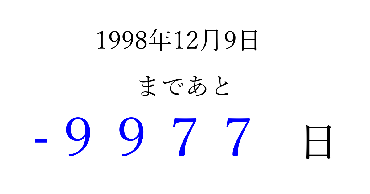 1998年12月9日(水)は もう 0000 日過ぎました 追加すると、トップページからすぐ選べるようになります ※2026/04/03現在の結果です。 最新の状態に更新する ↓シェアして、タイムライン上にカウントダウンを表示しよう!↓ 📤 この結果を共有する Tweet シェア Threads Bluesky 別の日付でカウントダウン 1998年12月のカレンダー このページをブックマークに追加すると、いつでもカウントダウンを確認できます。 (PC: Ctrl+D / Mac: ⌘+D) hitome-notes.comでは以下のページも運営しています。 指定日と期間から日付を計算 | ガチャ確率計算・シミュレーション | プライバシー・ポリシー 運営者:Avocado