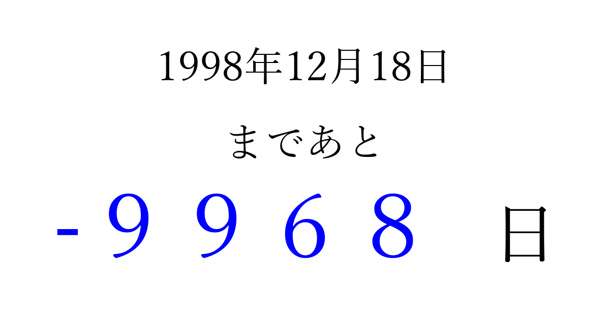 1998年12月18日(金)は もう 0000 日過ぎました 追加すると、トップページからすぐ選べるようになります ※2026/04/03現在の結果です。 最新の状態に更新する ↓シェアして、タイムライン上にカウントダウンを表示しよう!↓ 📤 この結果を共有する Tweet シェア Threads Bluesky 別の日付でカウントダウン 1998年12月のカレンダー このページをブックマークに追加すると、いつでもカウントダウンを確認できます。 (PC: Ctrl+D / Mac: ⌘+D) hitome-notes.comでは以下のページも運営しています。 指定日と期間から日付を計算 | ガチャ確率計算・シミュレーション | プライバシー・ポリシー 運営者:Avocado