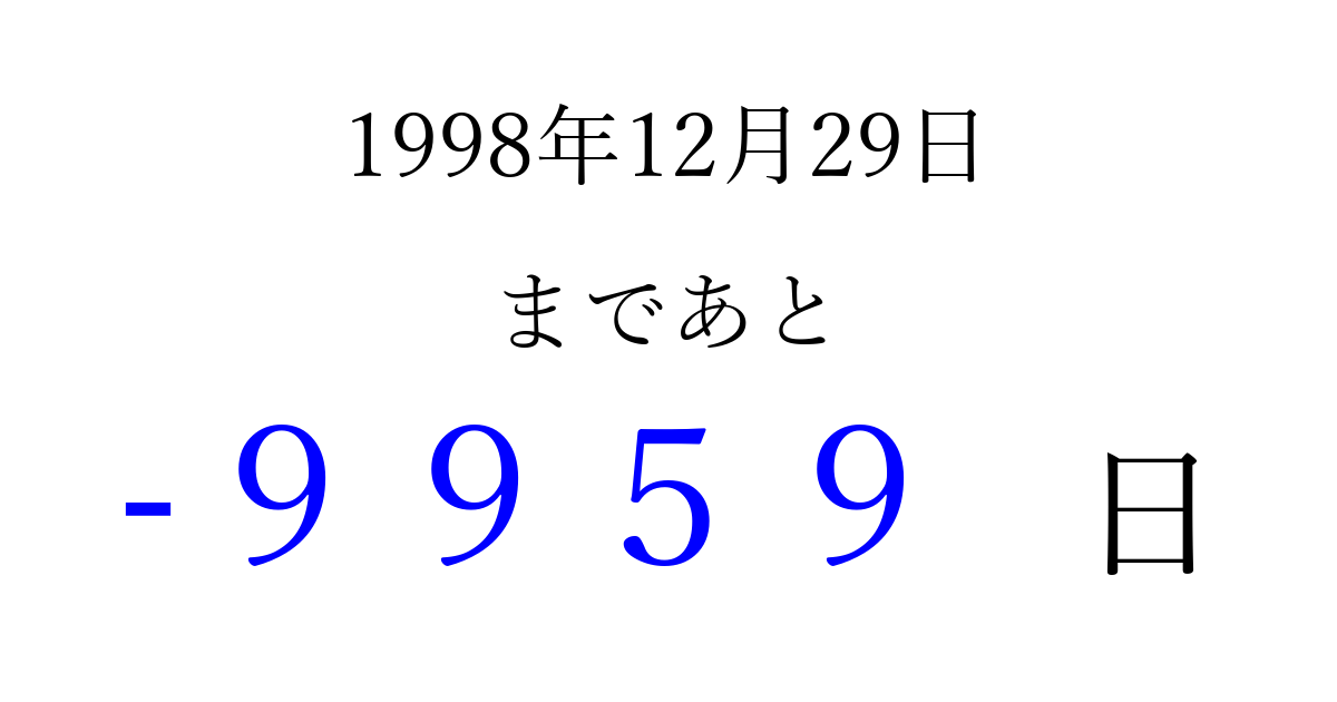 1998年12月29日(火)は もう 0000 日過ぎました 追加すると、トップページからすぐ選べるようになります ※2026/04/05現在の結果です。 最新の状態に更新する ↓シェアして、タイムライン上にカウントダウンを表示しよう!↓ 📤 この結果を共有する Tweet シェア Threads Bluesky 別の日付でカウントダウン 1998年12月のカレンダー このページをブックマークに追加すると、いつでもカウントダウンを確認できます。 (PC: Ctrl+D / Mac: ⌘+D) hitome-notes.comでは以下のページも運営しています。 指定日と期間から日付を計算 | ガチャ確率計算・シミュレーション | プライバシー・ポリシー 運営者:Avocado