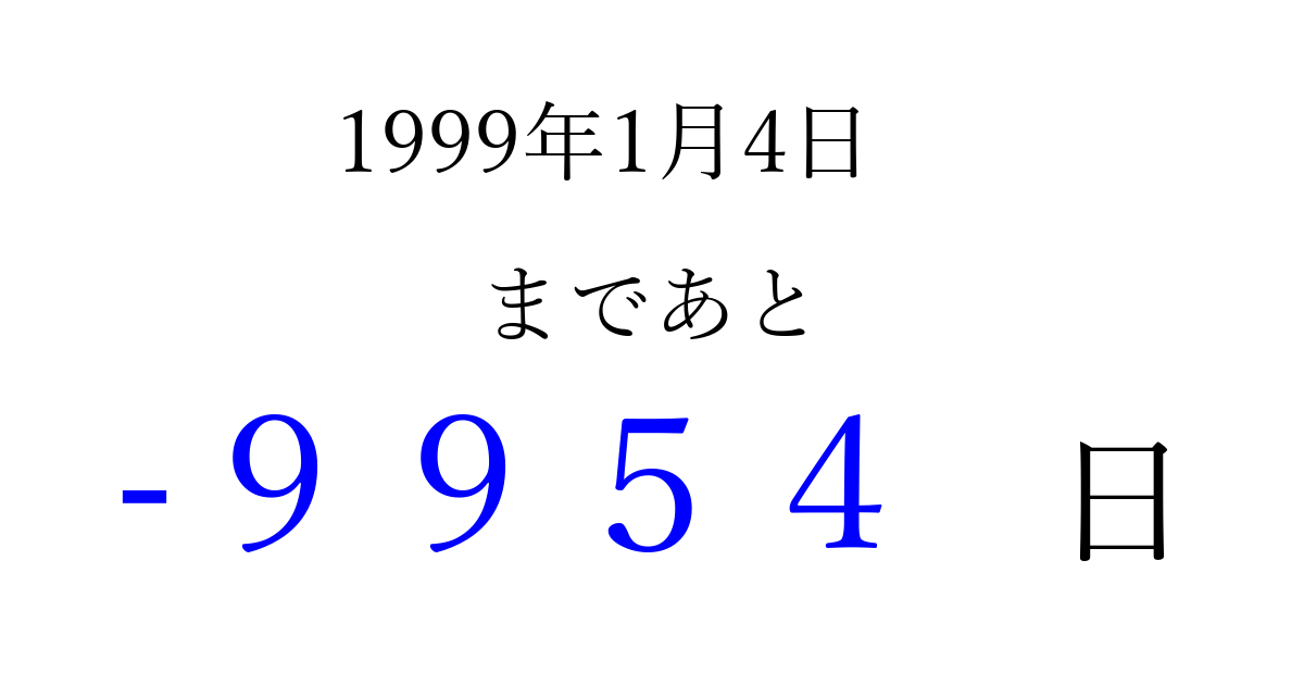 1999年1月4日(月)は もう 0000 日過ぎました 追加すると、トップページからすぐ選べるようになります ※2026/04/06現在の結果です。 最新の状態に更新する ↓シェアして、タイムライン上にカウントダウンを表示しよう!↓ 📤 この結果を共有する Tweet シェア Threads Bluesky 別の日付でカウントダウン 1999年1月のカレンダー このページをブックマークに追加すると、いつでもカウントダウンを確認できます。 (PC: Ctrl+D / Mac: ⌘+D) hitome-notes.comでは以下のページも運営しています。 指定日と期間から日付を計算 | ガチャ確率計算・シミュレーション | プライバシー・ポリシー 運営者:Avocado