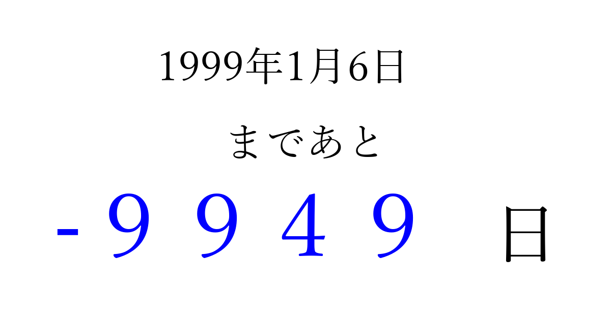 1999年1月6日(水)は もう 0000 日過ぎました 追加すると、トップページからすぐ選べるようになります ※2026/04/03現在の結果です。 最新の状態に更新する ↓シェアして、タイムライン上にカウントダウンを表示しよう!↓ 📤 この結果を共有する Tweet シェア Threads Bluesky 別の日付でカウントダウン 1999年1月のカレンダー このページをブックマークに追加すると、いつでもカウントダウンを確認できます。 (PC: Ctrl+D / Mac: ⌘+D) hitome-notes.comでは以下のページも運営しています。 指定日と期間から日付を計算 | ガチャ確率計算・シミュレーション | プライバシー・ポリシー 運営者:Avocado