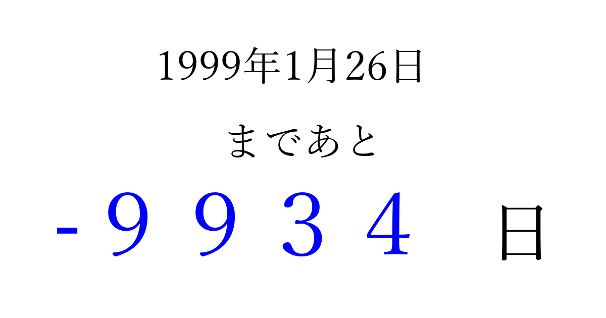 1999年1月26日(火)は もう 0000 日過ぎました 追加すると、トップページからすぐ選べるようになります ※2026/04/08現在の結果です。 最新の状態に更新する ↓シェアして、タイムライン上にカウントダウンを表示しよう!↓ 📤 この結果を共有する Tweet シェア Threads Bluesky 別の日付でカウントダウン 1999年1月のカレンダー このページをブックマークに追加すると、いつでもカウントダウンを確認できます。 (PC: Ctrl+D / Mac: ⌘+D) hitome-notes.comでは以下のページも運営しています。 指定日と期間から日付を計算 | ガチャ確率計算・シミュレーション | プライバシー・ポリシー 運営者:Avocado