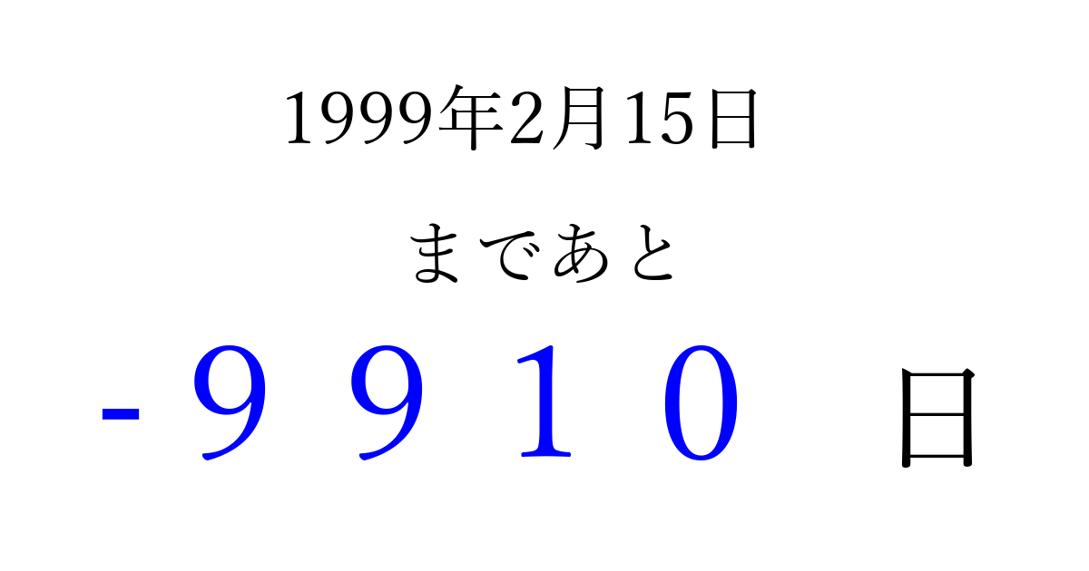 1999年2月15日(月)は もう 0000 日過ぎました 追加すると、トップページからすぐ選べるようになります ※2026/04/04現在の結果です。 最新の状態に更新する ↓シェアして、タイムライン上にカウントダウンを表示しよう!↓ 📤 この結果を共有する Tweet シェア Threads Bluesky 別の日付でカウントダウン 1999年2月のカレンダー このページをブックマークに追加すると、いつでもカウントダウンを確認できます。 (PC: Ctrl+D / Mac: ⌘+D) hitome-notes.comでは以下のページも運営しています。 指定日と期間から日付を計算 | ガチャ確率計算・シミュレーション | プライバシー・ポリシー 運営者:Avocado