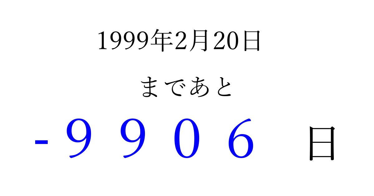 1999年2月20日(土)は もう 0000 日過ぎました 追加すると、トップページからすぐ選べるようになります ※2026/04/05現在の結果です。 最新の状態に更新する ↓シェアして、タイムライン上にカウントダウンを表示しよう!↓ 📤 この結果を共有する Tweet シェア Threads Bluesky 別の日付でカウントダウン 1999年2月のカレンダー このページをブックマークに追加すると、いつでもカウントダウンを確認できます。 (PC: Ctrl+D / Mac: ⌘+D) hitome-notes.comでは以下のページも運営しています。 指定日と期間から日付を計算 | ガチャ確率計算・シミュレーション | プライバシー・ポリシー 運営者:Avocado
