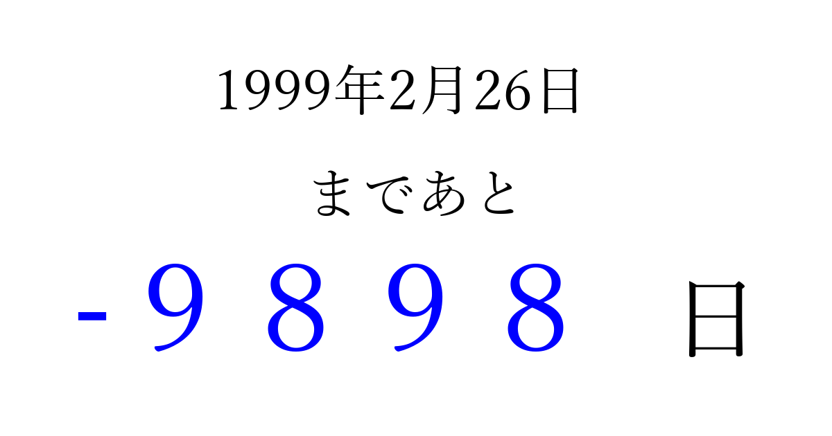1999年2月26日(金)は もう 0000 日過ぎました 追加すると、トップページからすぐ選べるようになります ※2026/04/03現在の結果です。 最新の状態に更新する ↓シェアして、タイムライン上にカウントダウンを表示しよう!↓ 📤 この結果を共有する Tweet シェア Threads Bluesky 別の日付でカウントダウン 1999年2月のカレンダー このページをブックマークに追加すると、いつでもカウントダウンを確認できます。 (PC: Ctrl+D / Mac: ⌘+D) hitome-notes.comでは以下のページも運営しています。 指定日と期間から日付を計算 | ガチャ確率計算・シミュレーション | プライバシー・ポリシー 運営者:Avocado