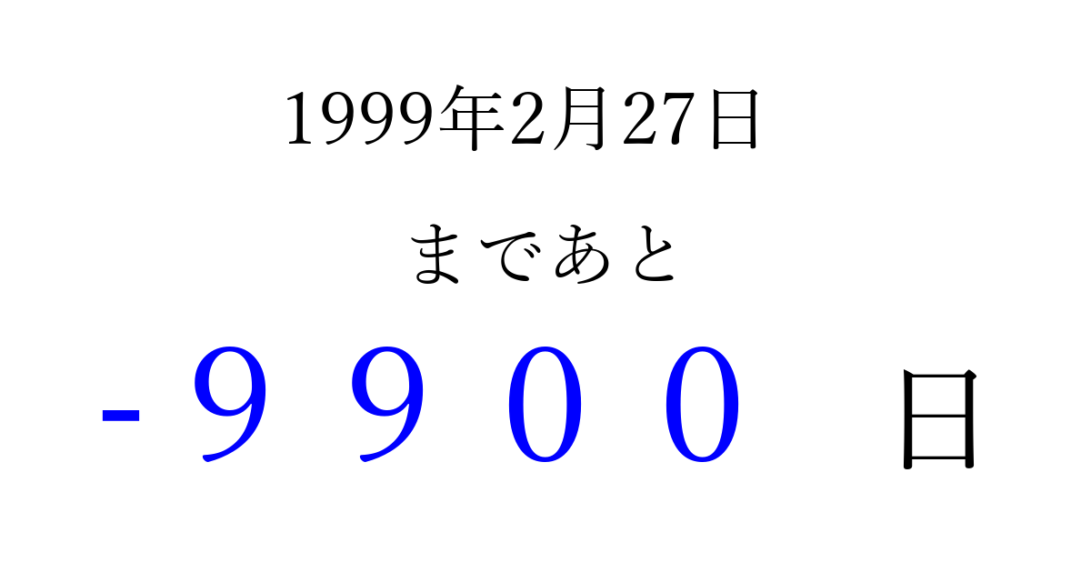 1999年2月27日(土)は もう 0000 日過ぎました 追加すると、トップページからすぐ選べるようになります ※2026/04/06現在の結果です。 最新の状態に更新する ↓シェアして、タイムライン上にカウントダウンを表示しよう!↓ 📤 この結果を共有する Tweet シェア Threads Bluesky 別の日付でカウントダウン 1999年2月のカレンダー このページをブックマークに追加すると、いつでもカウントダウンを確認できます。 (PC: Ctrl+D / Mac: ⌘+D) hitome-notes.comでは以下のページも運営しています。 指定日と期間から日付を計算 | ガチャ確率計算・シミュレーション | プライバシー・ポリシー 運営者:Avocado