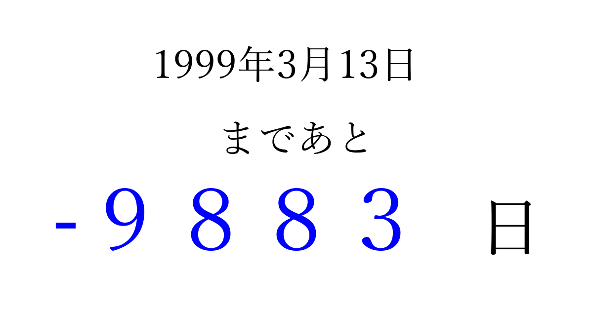 1999年3月13日(土)は もう 0000 日過ぎました 追加すると、トップページからすぐ選べるようになります ※2026/04/03現在の結果です。 最新の状態に更新する ↓シェアして、タイムライン上にカウントダウンを表示しよう!↓ 📤 この結果を共有する Tweet シェア Threads Bluesky 別の日付でカウントダウン 1999年3月のカレンダー このページをブックマークに追加すると、いつでもカウントダウンを確認できます。 (PC: Ctrl+D / Mac: ⌘+D) hitome-notes.comでは以下のページも運営しています。 指定日と期間から日付を計算 | ガチャ確率計算・シミュレーション | プライバシー・ポリシー 運営者:Avocado