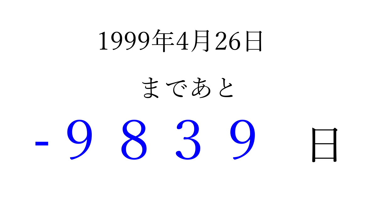 1999年4月26日(月)は もう 0000 日過ぎました 追加すると、トップページからすぐ選べるようになります ※2026/04/03現在の結果です。 最新の状態に更新する ↓シェアして、タイムライン上にカウントダウンを表示しよう!↓ 📤 この結果を共有する Tweet シェア Threads Bluesky 別の日付でカウントダウン 1999年4月のカレンダー このページをブックマークに追加すると、いつでもカウントダウンを確認できます。 (PC: Ctrl+D / Mac: ⌘+D) hitome-notes.comでは以下のページも運営しています。 指定日と期間から日付を計算 | ガチャ確率計算・シミュレーション | プライバシー・ポリシー 運営者:Avocado