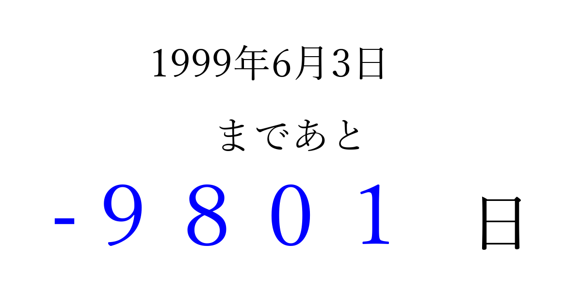 1999年6月3日(木)は もう 0000 日過ぎました 追加すると、トップページからすぐ選べるようになります ※2026/04/03現在の結果です。 最新の状態に更新する ↓シェアして、タイムライン上にカウントダウンを表示しよう!↓ 📤 この結果を共有する Tweet シェア Threads Bluesky 別の日付でカウントダウン 1999年6月のカレンダー このページをブックマークに追加すると、いつでもカウントダウンを確認できます。 (PC: Ctrl+D / Mac: ⌘+D) hitome-notes.comでは以下のページも運営しています。 指定日と期間から日付を計算 | ガチャ確率計算・シミュレーション | プライバシー・ポリシー 運営者:Avocado