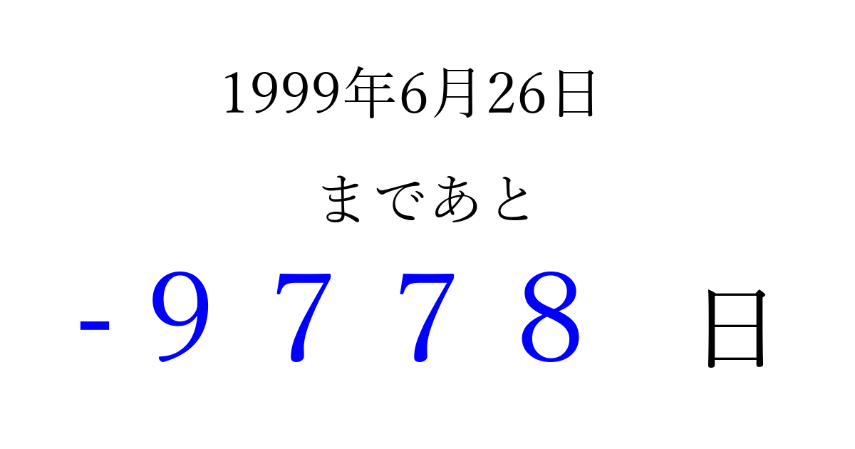 1999年6月26日(土)は もう 0000 日過ぎました 追加すると、トップページからすぐ選べるようになります ※2026/04/03現在の結果です。 最新の状態に更新する ↓シェアして、タイムライン上にカウントダウンを表示しよう!↓ 📤 この結果を共有する Tweet シェア Threads Bluesky 別の日付でカウントダウン 1999年6月のカレンダー このページをブックマークに追加すると、いつでもカウントダウンを確認できます。 (PC: Ctrl+D / Mac: ⌘+D) hitome-notes.comでは以下のページも運営しています。 指定日と期間から日付を計算 | ガチャ確率計算・シミュレーション | プライバシー・ポリシー 運営者:Avocado