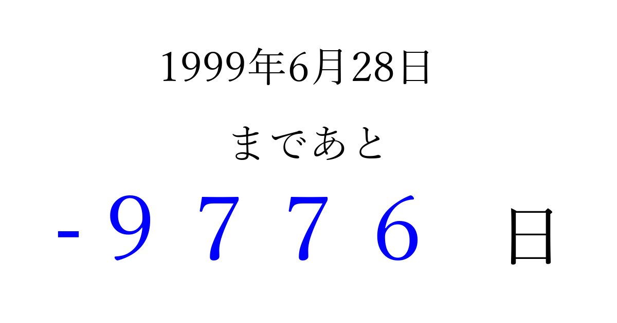 1999年6月28日(月)は もう 0000 日過ぎました 追加すると、トップページからすぐ選べるようになります ※2026/04/03現在の結果です。 最新の状態に更新する ↓シェアして、タイムライン上にカウントダウンを表示しよう!↓ 📤 この結果を共有する Tweet シェア Threads Bluesky 別の日付でカウントダウン 1999年6月のカレンダー このページをブックマークに追加すると、いつでもカウントダウンを確認できます。 (PC: Ctrl+D / Mac: ⌘+D) hitome-notes.comでは以下のページも運営しています。 指定日と期間から日付を計算 | ガチャ確率計算・シミュレーション | プライバシー・ポリシー 運営者:Avocado