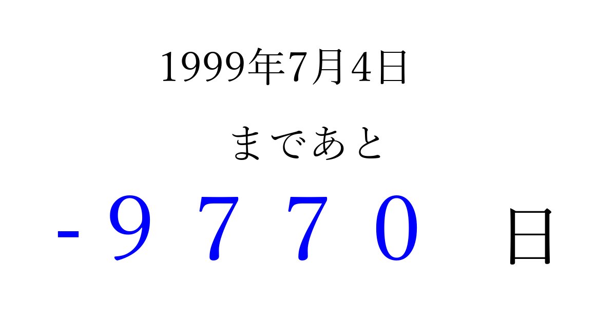 1999年7月4日(日)は もう 0000 日過ぎました 追加すると、トップページからすぐ選べるようになります ※2026/04/03現在の結果です。 最新の状態に更新する ↓シェアして、タイムライン上にカウントダウンを表示しよう!↓ 📤 この結果を共有する Tweet シェア Threads Bluesky 別の日付でカウントダウン 1999年7月のカレンダー このページをブックマークに追加すると、いつでもカウントダウンを確認できます。 (PC: Ctrl+D / Mac: ⌘+D) hitome-notes.comでは以下のページも運営しています。 指定日と期間から日付を計算 | ガチャ確率計算・シミュレーション | プライバシー・ポリシー 運営者:Avocado