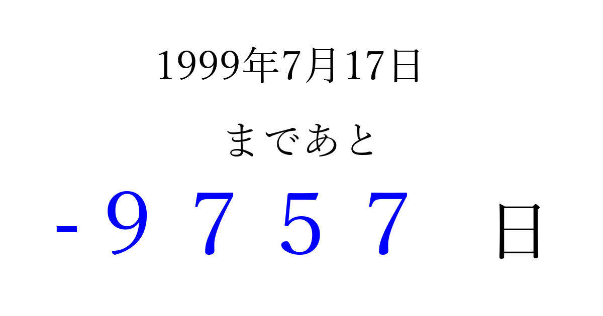 1999年7月17日(土)は もう 0000 日過ぎました 追加すると、トップページからすぐ選べるようになります ※2026/04/03現在の結果です。 最新の状態に更新する ↓シェアして、タイムライン上にカウントダウンを表示しよう!↓ 📤 この結果を共有する Tweet シェア Threads Bluesky 別の日付でカウントダウン 1999年7月のカレンダー このページをブックマークに追加すると、いつでもカウントダウンを確認できます。 (PC: Ctrl+D / Mac: ⌘+D) hitome-notes.comでは以下のページも運営しています。 指定日と期間から日付を計算 | ガチャ確率計算・シミュレーション | プライバシー・ポリシー 運営者:Avocado