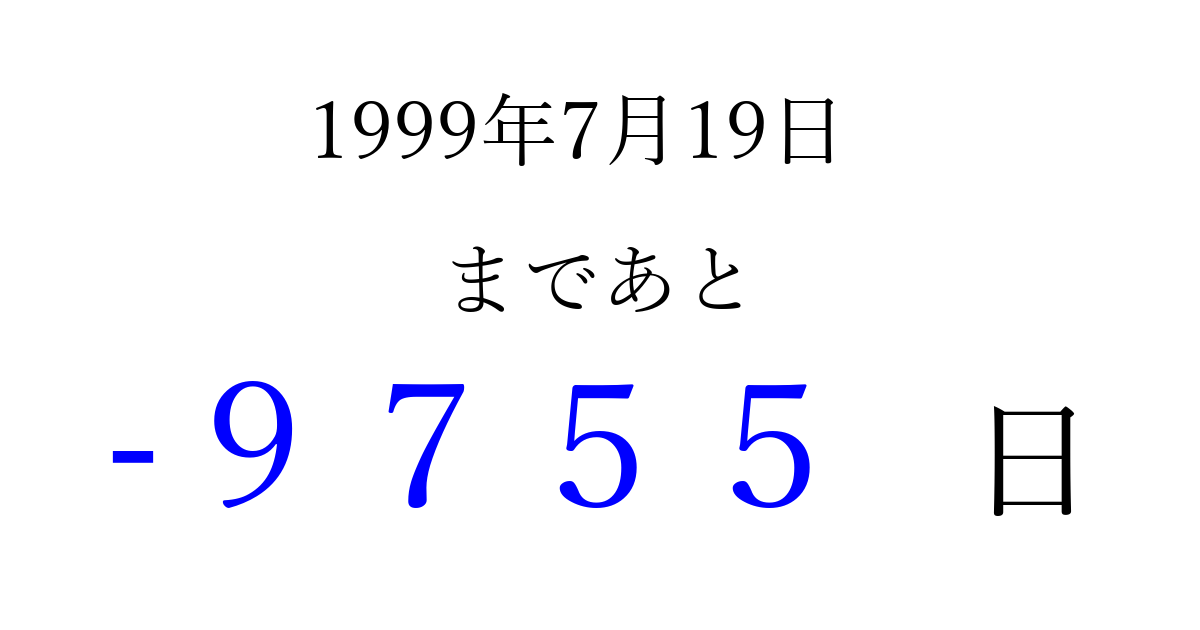 1999年7月19日(月)は もう 0000 日過ぎました 追加すると、トップページからすぐ選べるようになります ※2026/04/03現在の結果です。 最新の状態に更新する ↓シェアして、タイムライン上にカウントダウンを表示しよう!↓ 📤 この結果を共有する Tweet シェア Threads Bluesky 別の日付でカウントダウン 1999年7月のカレンダー このページをブックマークに追加すると、いつでもカウントダウンを確認できます。 (PC: Ctrl+D / Mac: ⌘+D) hitome-notes.comでは以下のページも運営しています。 指定日と期間から日付を計算 | ガチャ確率計算・シミュレーション | プライバシー・ポリシー 運営者:Avocado