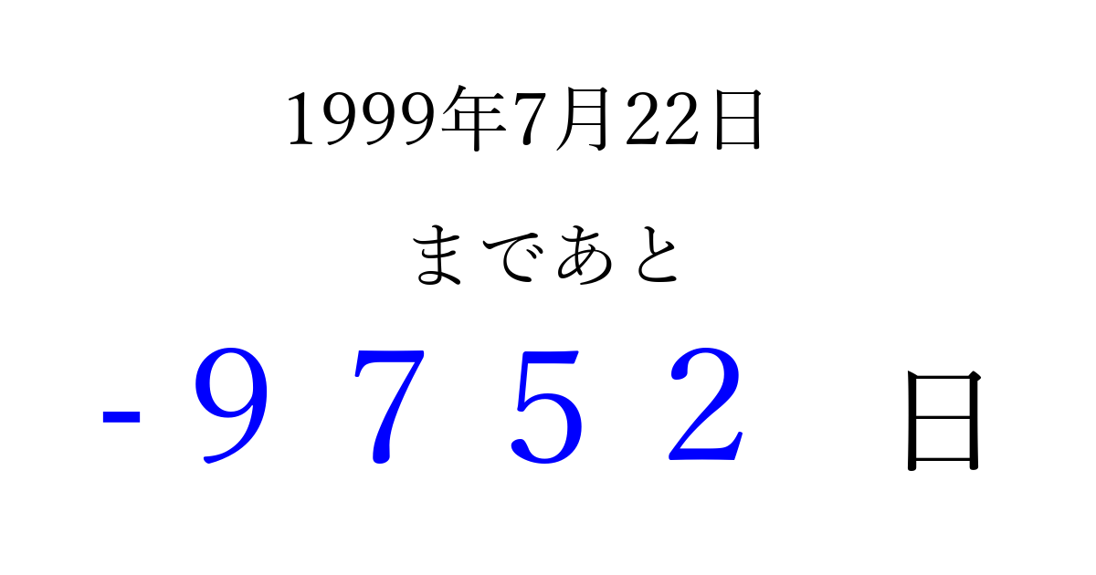 1999年7月22日(木)は もう 0000 日過ぎました 追加すると、トップページからすぐ選べるようになります ※2026/04/03現在の結果です。 最新の状態に更新する ↓シェアして、タイムライン上にカウントダウンを表示しよう!↓ 📤 この結果を共有する Tweet シェア Threads Bluesky 別の日付でカウントダウン 1999年7月のカレンダー このページをブックマークに追加すると、いつでもカウントダウンを確認できます。 (PC: Ctrl+D / Mac: ⌘+D) hitome-notes.comでは以下のページも運営しています。 指定日と期間から日付を計算 | ガチャ確率計算・シミュレーション | プライバシー・ポリシー 運営者:Avocado
