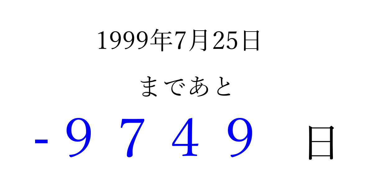 1999年7月25日(日)は もう 0000 日過ぎました 追加すると、トップページからすぐ選べるようになります ※2026/04/03現在の結果です。 最新の状態に更新する ↓シェアして、タイムライン上にカウントダウンを表示しよう!↓ 📤 この結果を共有する Tweet シェア Threads Bluesky 別の日付でカウントダウン 1999年7月のカレンダー このページをブックマークに追加すると、いつでもカウントダウンを確認できます。 (PC: Ctrl+D / Mac: ⌘+D) hitome-notes.comでは以下のページも運営しています。 指定日と期間から日付を計算 | ガチャ確率計算・シミュレーション | プライバシー・ポリシー 運営者:Avocado