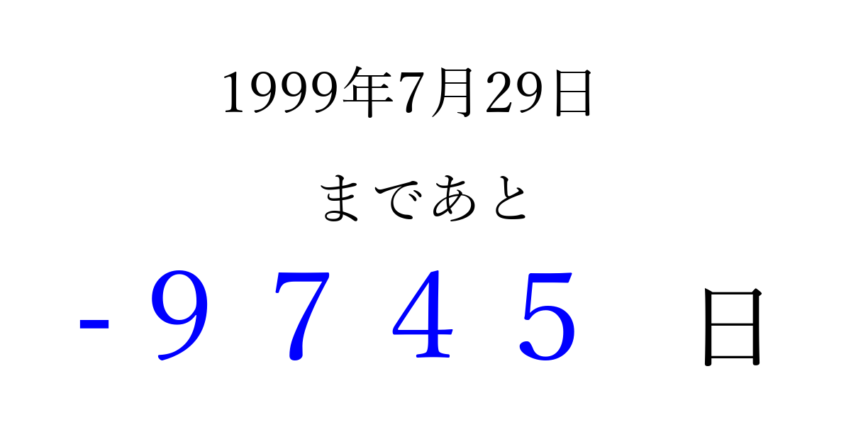 1999年7月29日(木)は もう 0000 日過ぎました 追加すると、トップページからすぐ選べるようになります ※2026/04/03現在の結果です。 最新の状態に更新する ↓シェアして、タイムライン上にカウントダウンを表示しよう!↓ 📤 この結果を共有する Tweet シェア Threads Bluesky 別の日付でカウントダウン 1999年7月のカレンダー このページをブックマークに追加すると、いつでもカウントダウンを確認できます。 (PC: Ctrl+D / Mac: ⌘+D) hitome-notes.comでは以下のページも運営しています。 指定日と期間から日付を計算 | ガチャ確率計算・シミュレーション | プライバシー・ポリシー 運営者:Avocado