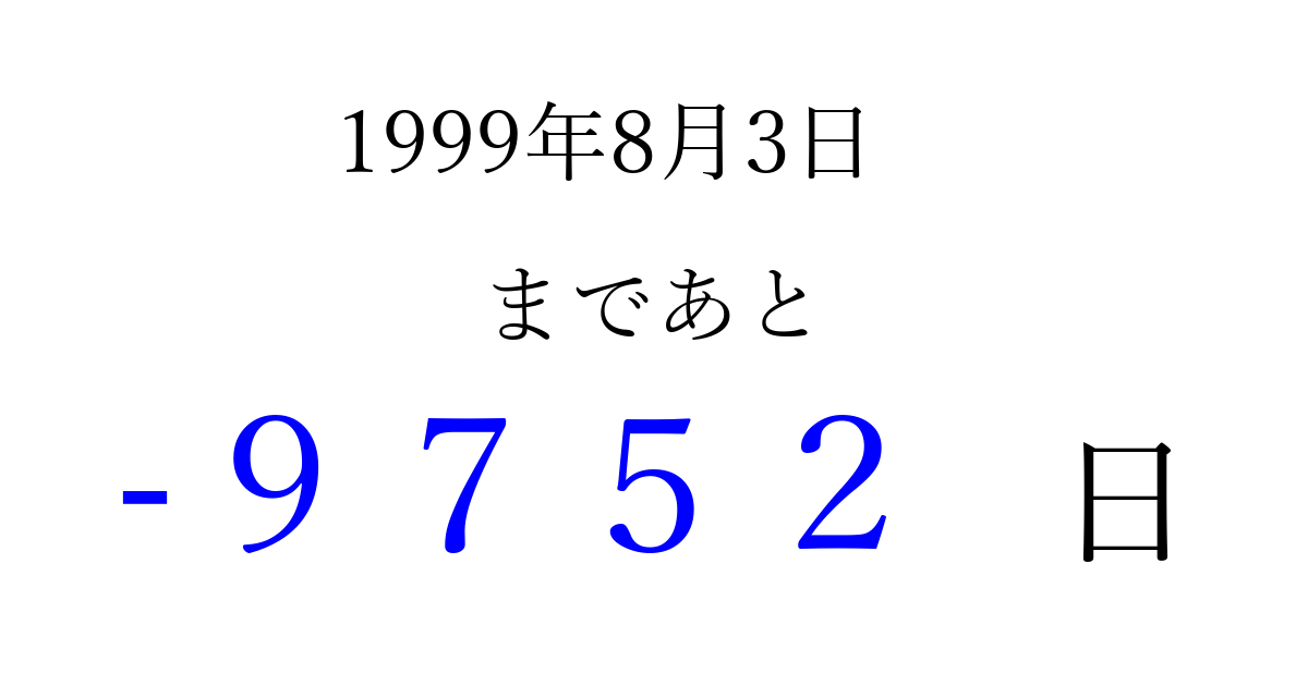 1999年8月3日(火)は もう 0000 日過ぎました 追加すると、トップページからすぐ選べるようになります ※2026/04/15現在の結果です。 最新の状態に更新する ↓シェアして、タイムライン上にカウントダウンを表示しよう!↓ 📤 この結果を共有する Tweet シェア Threads Bluesky 別の日付でカウントダウン 1999年8月のカレンダー このページをブックマークに追加すると、いつでもカウントダウンを確認できます。 (PC: Ctrl+D / Mac: ⌘+D) hitome-notes.comでは以下のページも運営しています。 指定日と期間から日付を計算 | ガチャ確率計算・シミュレーション | プライバシー・ポリシー 運営者:Avocado