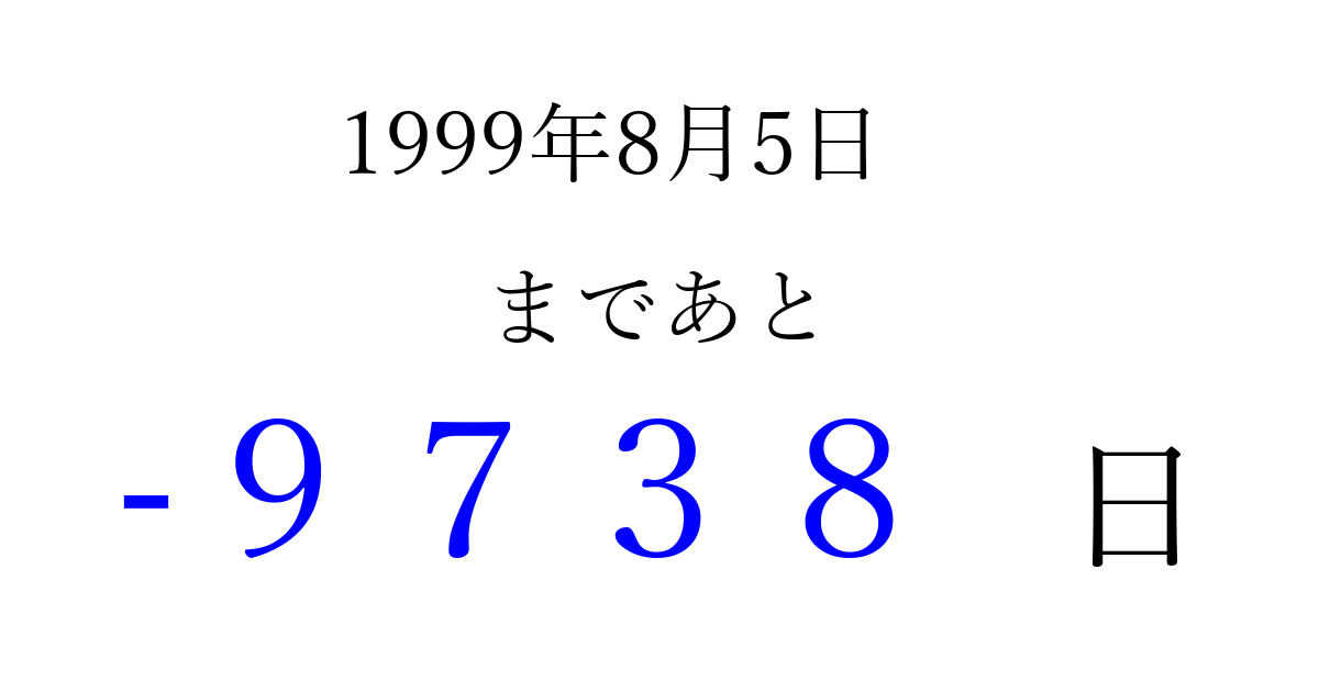 1999年8月5日(木)は もう 0000 日過ぎました 追加すると、トップページからすぐ選べるようになります ※2026/04/03現在の結果です。 最新の状態に更新する ↓シェアして、タイムライン上にカウントダウンを表示しよう!↓ 📤 この結果を共有する Tweet シェア Threads Bluesky 別の日付でカウントダウン 1999年8月のカレンダー このページをブックマークに追加すると、いつでもカウントダウンを確認できます。 (PC: Ctrl+D / Mac: ⌘+D) hitome-notes.comでは以下のページも運営しています。 指定日と期間から日付を計算 | ガチャ確率計算・シミュレーション | プライバシー・ポリシー 運営者:Avocado