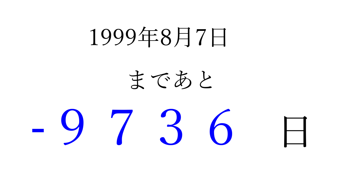 1999年8月7日(土)は もう 0000 日過ぎました 追加すると、トップページからすぐ選べるようになります ※2026/04/03現在の結果です。 最新の状態に更新する ↓シェアして、タイムライン上にカウントダウンを表示しよう!↓ 📤 この結果を共有する Tweet シェア Threads Bluesky 別の日付でカウントダウン 1999年8月のカレンダー このページをブックマークに追加すると、いつでもカウントダウンを確認できます。 (PC: Ctrl+D / Mac: ⌘+D) hitome-notes.comでは以下のページも運営しています。 指定日と期間から日付を計算 | ガチャ確率計算・シミュレーション | プライバシー・ポリシー 運営者:Avocado