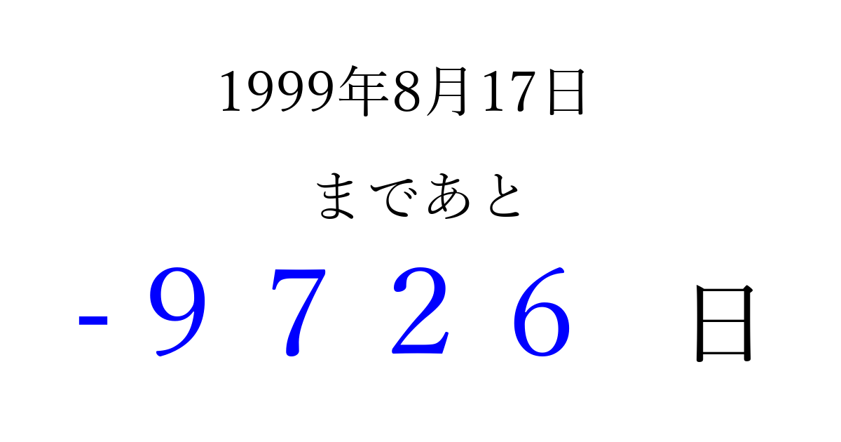 1999年8月17日(火)は もう 0000 日過ぎました 追加すると、トップページからすぐ選べるようになります ※2026/04/03現在の結果です。 最新の状態に更新する ↓シェアして、タイムライン上にカウントダウンを表示しよう!↓ 📤 この結果を共有する Tweet シェア Threads Bluesky 別の日付でカウントダウン 1999年8月のカレンダー このページをブックマークに追加すると、いつでもカウントダウンを確認できます。 (PC: Ctrl+D / Mac: ⌘+D) hitome-notes.comでは以下のページも運営しています。 指定日と期間から日付を計算 | ガチャ確率計算・シミュレーション | プライバシー・ポリシー 運営者:Avocado