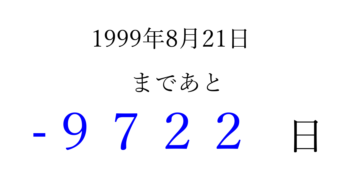 1999年8月21日(土)は もう 0000 日過ぎました 追加すると、トップページからすぐ選べるようになります ※2026/04/03現在の結果です。 最新の状態に更新する ↓シェアして、タイムライン上にカウントダウンを表示しよう!↓ 📤 この結果を共有する Tweet シェア Threads Bluesky 別の日付でカウントダウン 1999年8月のカレンダー このページをブックマークに追加すると、いつでもカウントダウンを確認できます。 (PC: Ctrl+D / Mac: ⌘+D) hitome-notes.comでは以下のページも運営しています。 指定日と期間から日付を計算 | ガチャ確率計算・シミュレーション | プライバシー・ポリシー 運営者:Avocado