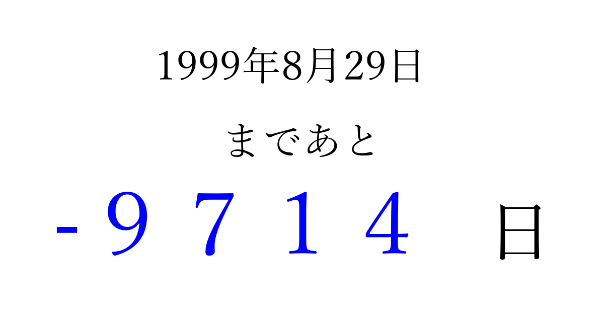 1999年8月29日(日)は もう 0000 日過ぎました 追加すると、トップページからすぐ選べるようになります ※2026/04/03現在の結果です。 最新の状態に更新する ↓シェアして、タイムライン上にカウントダウンを表示しよう!↓ 📤 この結果を共有する Tweet シェア Threads Bluesky 別の日付でカウントダウン 1999年8月のカレンダー このページをブックマークに追加すると、いつでもカウントダウンを確認できます。 (PC: Ctrl+D / Mac: ⌘+D) hitome-notes.comでは以下のページも運営しています。 指定日と期間から日付を計算 | ガチャ確率計算・シミュレーション | プライバシー・ポリシー 運営者:Avocado