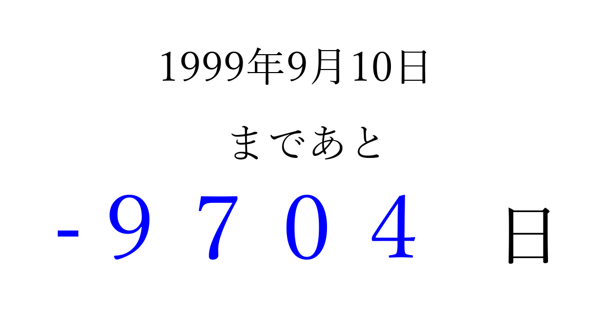 1999年9月10日(金)は もう 0000 日過ぎました 追加すると、トップページからすぐ選べるようになります ※2026/04/05現在の結果です。 最新の状態に更新する ↓シェアして、タイムライン上にカウントダウンを表示しよう!↓ 📤 この結果を共有する Tweet シェア Threads Bluesky 別の日付でカウントダウン 1999年9月のカレンダー このページをブックマークに追加すると、いつでもカウントダウンを確認できます。 (PC: Ctrl+D / Mac: ⌘+D) hitome-notes.comでは以下のページも運営しています。 指定日と期間から日付を計算 | ガチャ確率計算・シミュレーション | プライバシー・ポリシー 運営者:Avocado