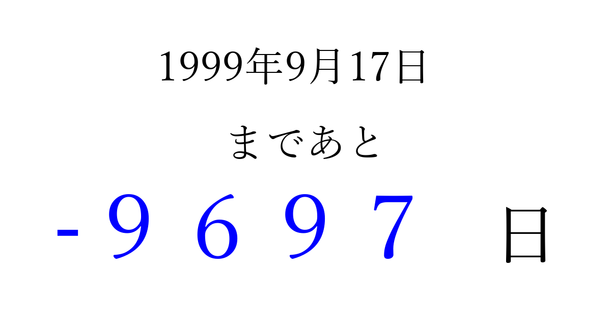 1999年9月17日(金)は もう 0000 日過ぎました 追加すると、トップページからすぐ選べるようになります ※2026/04/05現在の結果です。 最新の状態に更新する ↓シェアして、タイムライン上にカウントダウンを表示しよう!↓ 📤 この結果を共有する Tweet シェア Threads Bluesky 別の日付でカウントダウン 1999年9月のカレンダー このページをブックマークに追加すると、いつでもカウントダウンを確認できます。 (PC: Ctrl+D / Mac: ⌘+D) hitome-notes.comでは以下のページも運営しています。 指定日と期間から日付を計算 | ガチャ確率計算・シミュレーション | プライバシー・ポリシー 運営者:Avocado