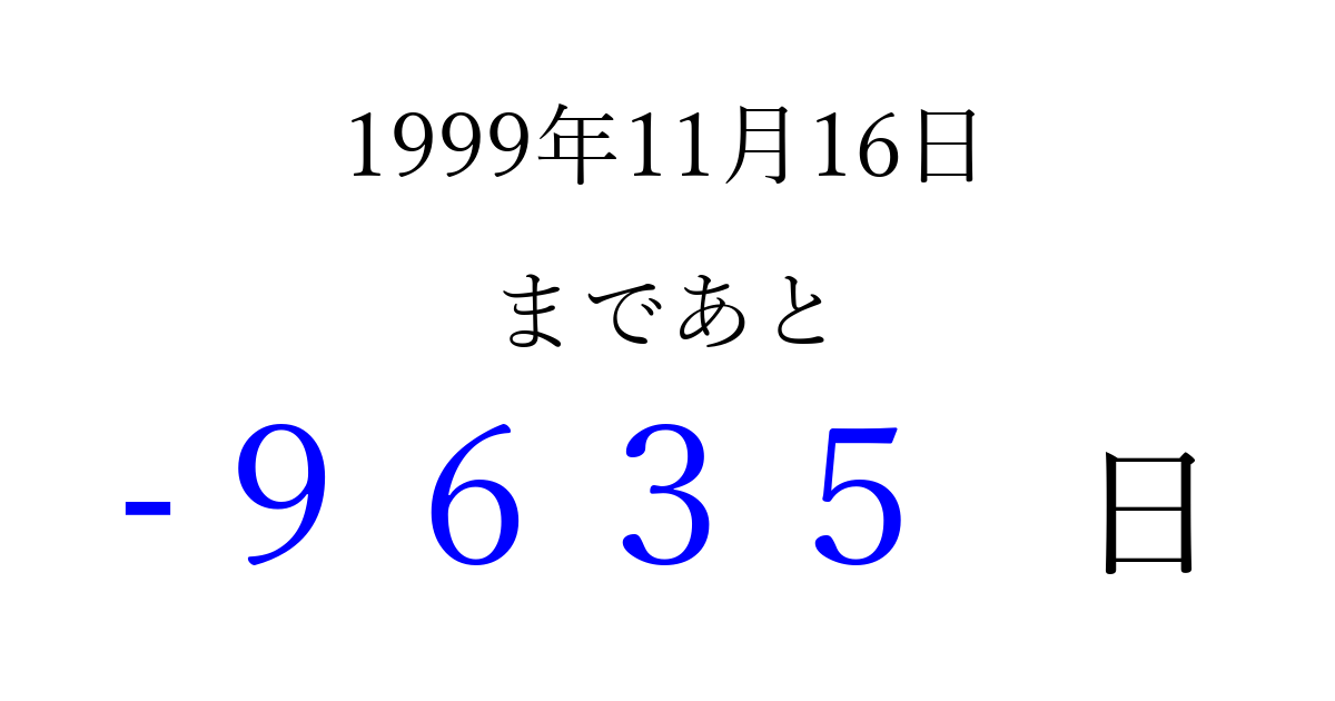 1999年11月16日(火)は もう 0000 日過ぎました 追加すると、トップページからすぐ選べるようになります ※2026/04/03現在の結果です。 最新の状態に更新する ↓シェアして、タイムライン上にカウントダウンを表示しよう!↓ 📤 この結果を共有する Tweet シェア Threads Bluesky 別の日付でカウントダウン 1999年11月のカレンダー このページをブックマークに追加すると、いつでもカウントダウンを確認できます。 (PC: Ctrl+D / Mac: ⌘+D) hitome-notes.comでは以下のページも運営しています。 指定日と期間から日付を計算 | ガチャ確率計算・シミュレーション | プライバシー・ポリシー 運営者:Avocado