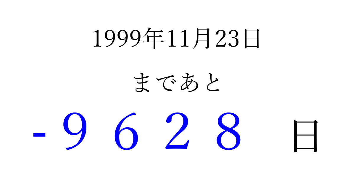 1999年11月23日(火)は もう 0000 日過ぎました 追加すると、トップページからすぐ選べるようになります ※2026/04/03現在の結果です。 最新の状態に更新する ↓シェアして、タイムライン上にカウントダウンを表示しよう!↓ 📤 この結果を共有する Tweet シェア Threads Bluesky 別の日付でカウントダウン 1999年11月のカレンダー このページをブックマークに追加すると、いつでもカウントダウンを確認できます。 (PC: Ctrl+D / Mac: ⌘+D) hitome-notes.comでは以下のページも運営しています。 指定日と期間から日付を計算 | ガチャ確率計算・シミュレーション | プライバシー・ポリシー 運営者:Avocado
