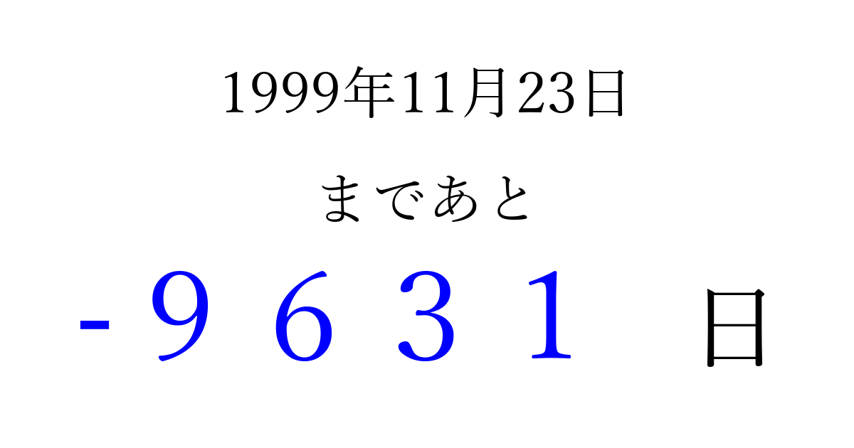 1999年11月23日(火)は もう 0000 日過ぎました 追加すると、トップページからすぐ選べるようになります ※2026/04/06現在の結果です。 最新の状態に更新する ↓シェアして、タイムライン上にカウントダウンを表示しよう!↓ 📤 この結果を共有する Tweet シェア Threads Bluesky 別の日付でカウントダウン 1999年11月のカレンダー このページをブックマークに追加すると、いつでもカウントダウンを確認できます。 (PC: Ctrl+D / Mac: ⌘+D) hitome-notes.comでは以下のページも運営しています。 指定日と期間から日付を計算 | ガチャ確率計算・シミュレーション | プライバシー・ポリシー 運営者:Avocado