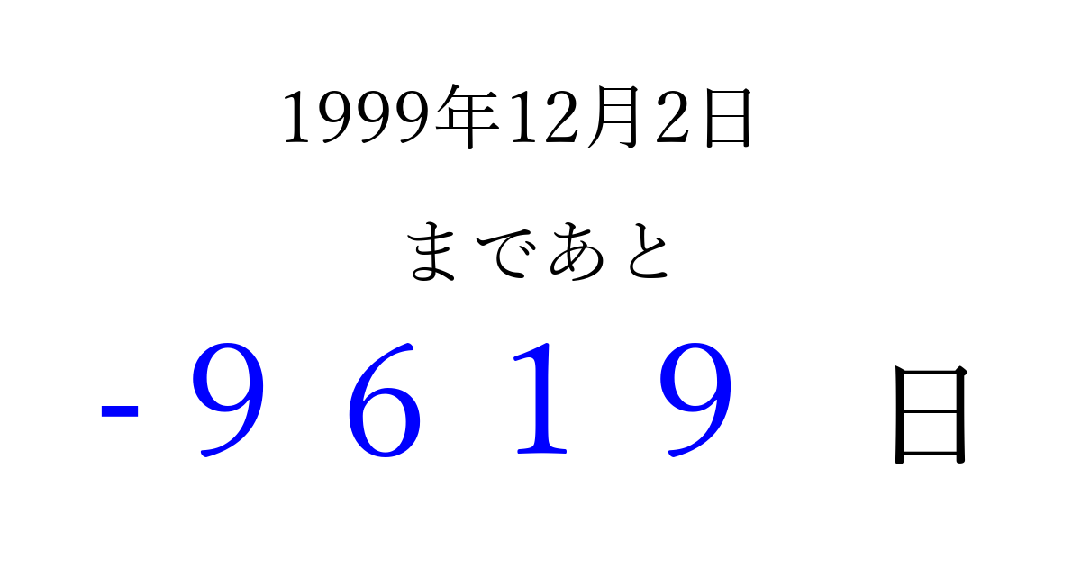 1999年12月2日(木)は もう 0000 日過ぎました 追加すると、トップページからすぐ選べるようになります ※2026/04/03現在の結果です。 最新の状態に更新する ↓シェアして、タイムライン上にカウントダウンを表示しよう!↓ 📤 この結果を共有する Tweet シェア Threads Bluesky 別の日付でカウントダウン 1999年12月のカレンダー このページをブックマークに追加すると、いつでもカウントダウンを確認できます。 (PC: Ctrl+D / Mac: ⌘+D) hitome-notes.comでは以下のページも運営しています。 指定日と期間から日付を計算 | ガチャ確率計算・シミュレーション | プライバシー・ポリシー 運営者:Avocado