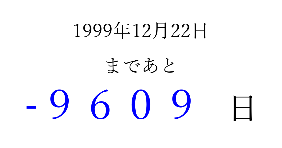 1999年12月22日(水)は もう 0000 日過ぎました 追加すると、トップページからすぐ選べるようになります ※2026/04/13現在の結果です。 最新の状態に更新する ↓シェアして、タイムライン上にカウントダウンを表示しよう!↓ 📤 この結果を共有する Tweet シェア Threads Bluesky 別の日付でカウントダウン 1999年12月のカレンダー このページをブックマークに追加すると、いつでもカウントダウンを確認できます。 (PC: Ctrl+D / Mac: ⌘+D) hitome-notes.comでは以下のページも運営しています。 指定日と期間から日付を計算 | ガチャ確率計算・シミュレーション | プライバシー・ポリシー 運営者:Avocado