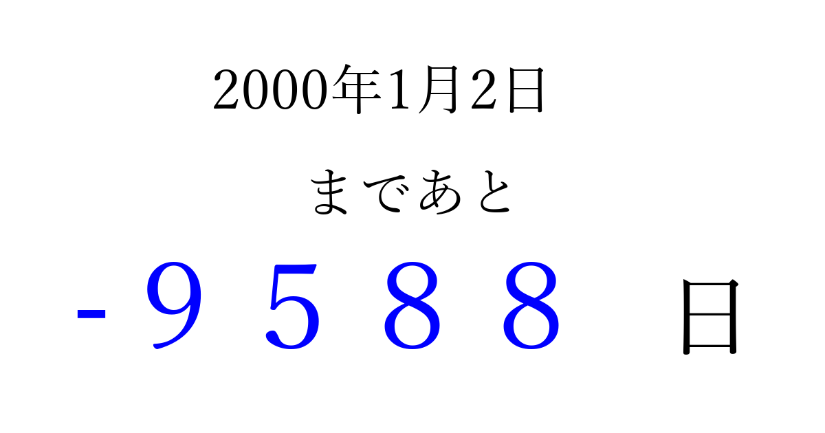 2000年1月2日(日)は もう 0000 日過ぎました 追加すると、トップページからすぐ選べるようになります ※2026/04/03現在の結果です。 最新の状態に更新する ↓シェアして、タイムライン上にカウントダウンを表示しよう!↓ 📤 この結果を共有する Tweet シェア Threads Bluesky 別の日付でカウントダウン 2000年1月のカレンダー このページをブックマークに追加すると、いつでもカウントダウンを確認できます。 (PC: Ctrl+D / Mac: ⌘+D) hitome-notes.comでは以下のページも運営しています。 指定日と期間から日付を計算 | ガチャ確率計算・シミュレーション | プライバシー・ポリシー 運営者:Avocado