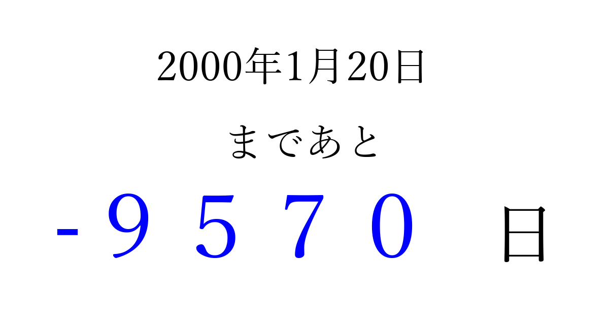 2000年1月20日(木)は もう 0000 日過ぎました 追加すると、トップページからすぐ選べるようになります ※2026/04/03現在の結果です。 最新の状態に更新する ↓シェアして、タイムライン上にカウントダウンを表示しよう!↓ 📤 この結果を共有する Tweet シェア Threads Bluesky 別の日付でカウントダウン 2000年1月のカレンダー このページをブックマークに追加すると、いつでもカウントダウンを確認できます。 (PC: Ctrl+D / Mac: ⌘+D) hitome-notes.comでは以下のページも運営しています。 指定日と期間から日付を計算 | ガチャ確率計算・シミュレーション | プライバシー・ポリシー 運営者:Avocado