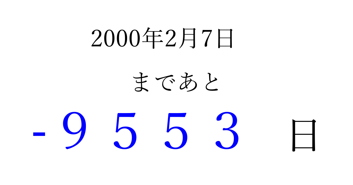 2000年2月7日(月)は もう 0000 日過ぎました 追加すると、トップページからすぐ選べるようになります ※2026/04/04現在の結果です。 最新の状態に更新する ↓シェアして、タイムライン上にカウントダウンを表示しよう!↓ 📤 この結果を共有する Tweet シェア Threads Bluesky 別の日付でカウントダウン 2000年2月のカレンダー このページをブックマークに追加すると、いつでもカウントダウンを確認できます。 (PC: Ctrl+D / Mac: ⌘+D) hitome-notes.comでは以下のページも運営しています。 指定日と期間から日付を計算 | ガチャ確率計算・シミュレーション | プライバシー・ポリシー 運営者:Avocado