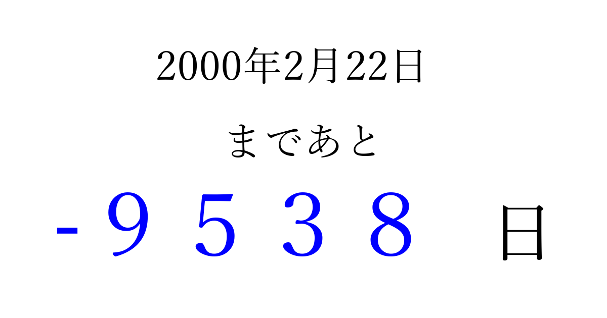 2000年2月22日(火)は もう 0000 日過ぎました 追加すると、トップページからすぐ選べるようになります ※2026/04/04現在の結果です。 最新の状態に更新する ↓シェアして、タイムライン上にカウントダウンを表示しよう!↓ 📤 この結果を共有する Tweet シェア Threads Bluesky 別の日付でカウントダウン 2000年2月のカレンダー このページをブックマークに追加すると、いつでもカウントダウンを確認できます。 (PC: Ctrl+D / Mac: ⌘+D) hitome-notes.comでは以下のページも運営しています。 指定日と期間から日付を計算 | ガチャ確率計算・シミュレーション | プライバシー・ポリシー 運営者:Avocado