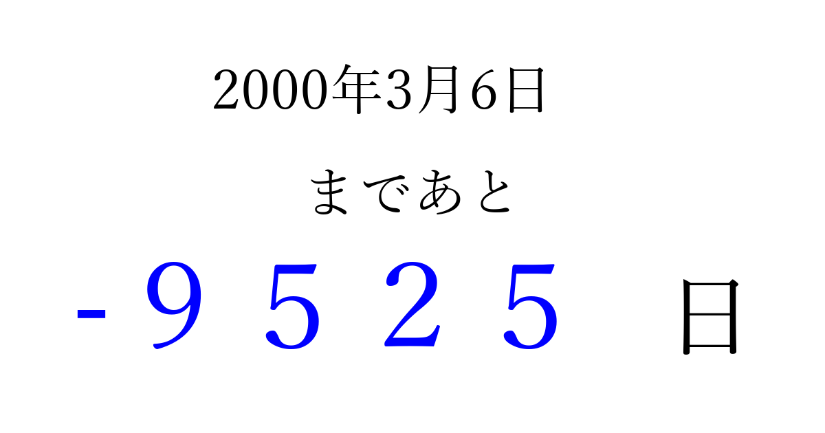 2000年3月6日(月)は もう 0000 日過ぎました 追加すると、トップページからすぐ選べるようになります ※2026/04/04現在の結果です。 最新の状態に更新する ↓シェアして、タイムライン上にカウントダウンを表示しよう!↓ 📤 この結果を共有する Tweet シェア Threads Bluesky 別の日付でカウントダウン 2000年3月のカレンダー このページをブックマークに追加すると、いつでもカウントダウンを確認できます。 (PC: Ctrl+D / Mac: ⌘+D) hitome-notes.comでは以下のページも運営しています。 指定日と期間から日付を計算 | ガチャ確率計算・シミュレーション | プライバシー・ポリシー 運営者:Avocado