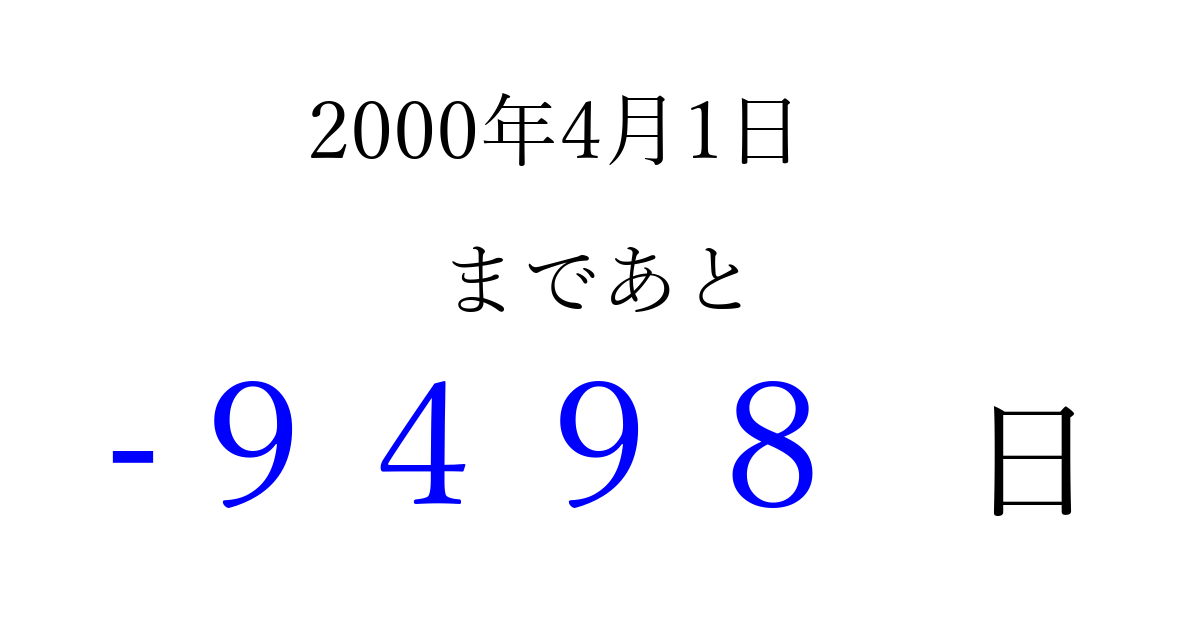 2000年4月1日(土)は もう 0000 日過ぎました 追加すると、トップページからすぐ選べるようになります ※2026/04/03現在の結果です。 最新の状態に更新する ↓シェアして、タイムライン上にカウントダウンを表示しよう!↓ 📤 この結果を共有する Tweet シェア Threads Bluesky 別の日付でカウントダウン 2000年4月のカレンダー このページをブックマークに追加すると、いつでもカウントダウンを確認できます。 (PC: Ctrl+D / Mac: ⌘+D) hitome-notes.comでは以下のページも運営しています。 指定日と期間から日付を計算 | ガチャ確率計算・シミュレーション | プライバシー・ポリシー 運営者:Avocado