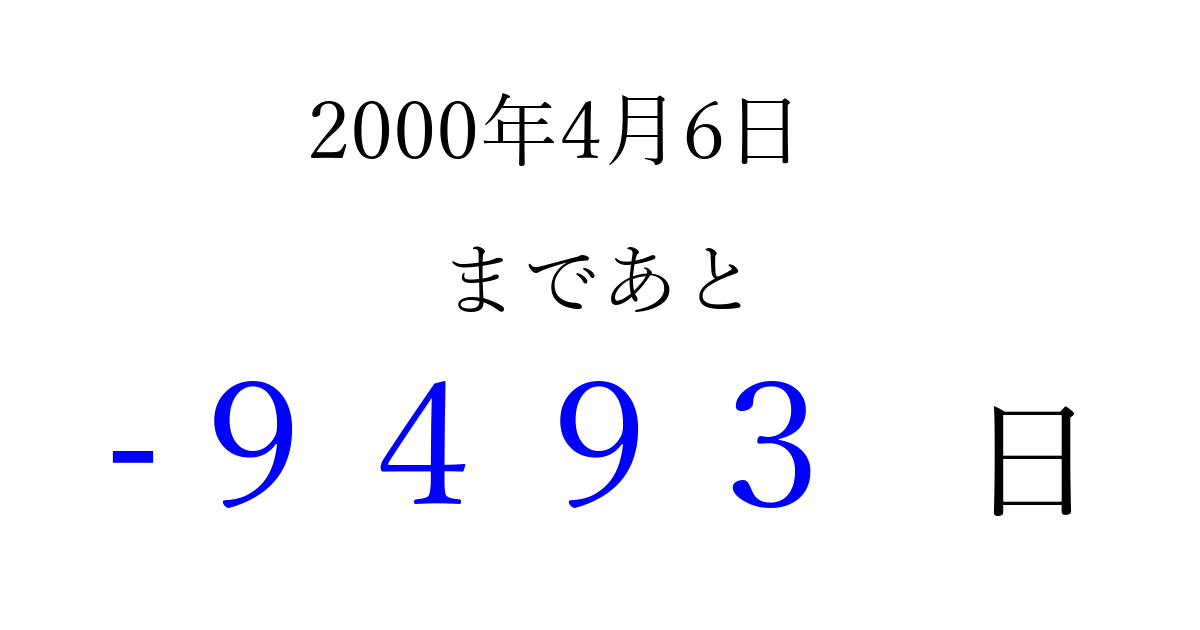 2000年4月6日(木)は もう 0000 日過ぎました 追加すると、トップページからすぐ選べるようになります ※2026/04/03現在の結果です。 最新の状態に更新する ↓シェアして、タイムライン上にカウントダウンを表示しよう!↓ 📤 この結果を共有する Tweet シェア Threads Bluesky 別の日付でカウントダウン 2000年4月のカレンダー このページをブックマークに追加すると、いつでもカウントダウンを確認できます。 (PC: Ctrl+D / Mac: ⌘+D) hitome-notes.comでは以下のページも運営しています。 指定日と期間から日付を計算 | ガチャ確率計算・シミュレーション | プライバシー・ポリシー 運営者:Avocado