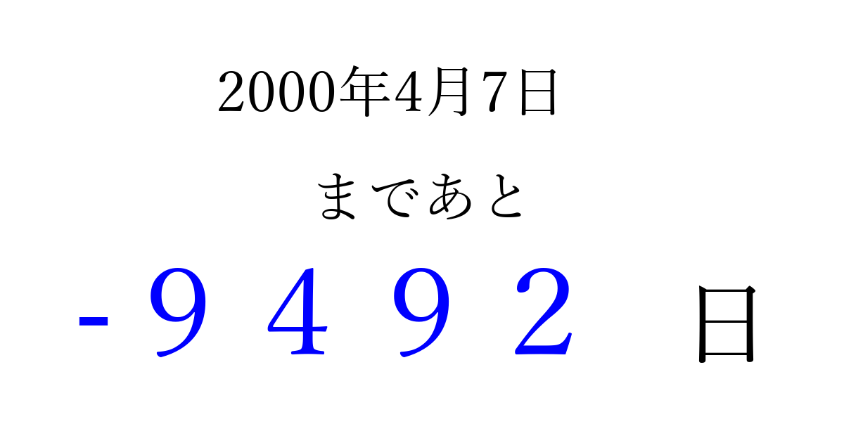 2000年4月7日(金)は もう 0000 日過ぎました 追加すると、トップページからすぐ選べるようになります ※2026/04/03現在の結果です。 最新の状態に更新する ↓シェアして、タイムライン上にカウントダウンを表示しよう!↓ 📤 この結果を共有する Tweet シェア Threads Bluesky 別の日付でカウントダウン 2000年4月のカレンダー このページをブックマークに追加すると、いつでもカウントダウンを確認できます。 (PC: Ctrl+D / Mac: ⌘+D) hitome-notes.comでは以下のページも運営しています。 指定日と期間から日付を計算 | ガチャ確率計算・シミュレーション | プライバシー・ポリシー 運営者:Avocado