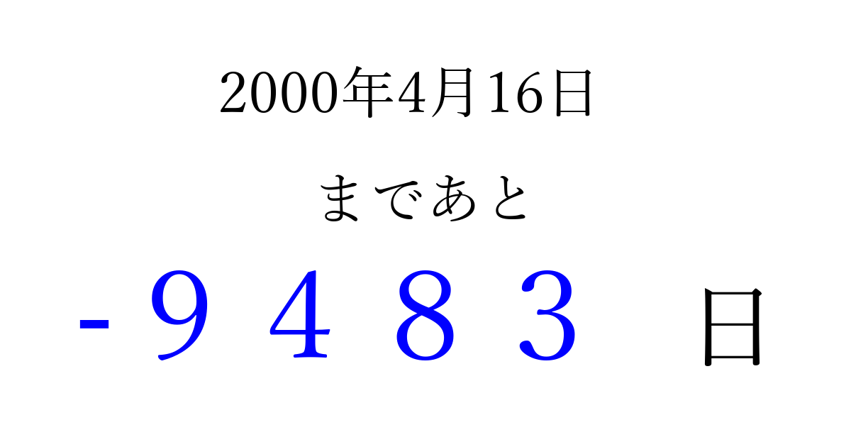 2000年4月16日(日)は もう 0000 日過ぎました 追加すると、トップページからすぐ選べるようになります ※2026/04/03現在の結果です。 最新の状態に更新する ↓シェアして、タイムライン上にカウントダウンを表示しよう!↓ 📤 この結果を共有する Tweet シェア Threads Bluesky 別の日付でカウントダウン 2000年4月のカレンダー このページをブックマークに追加すると、いつでもカウントダウンを確認できます。 (PC: Ctrl+D / Mac: ⌘+D) hitome-notes.comでは以下のページも運営しています。 指定日と期間から日付を計算 | ガチャ確率計算・シミュレーション | プライバシー・ポリシー 運営者:Avocado