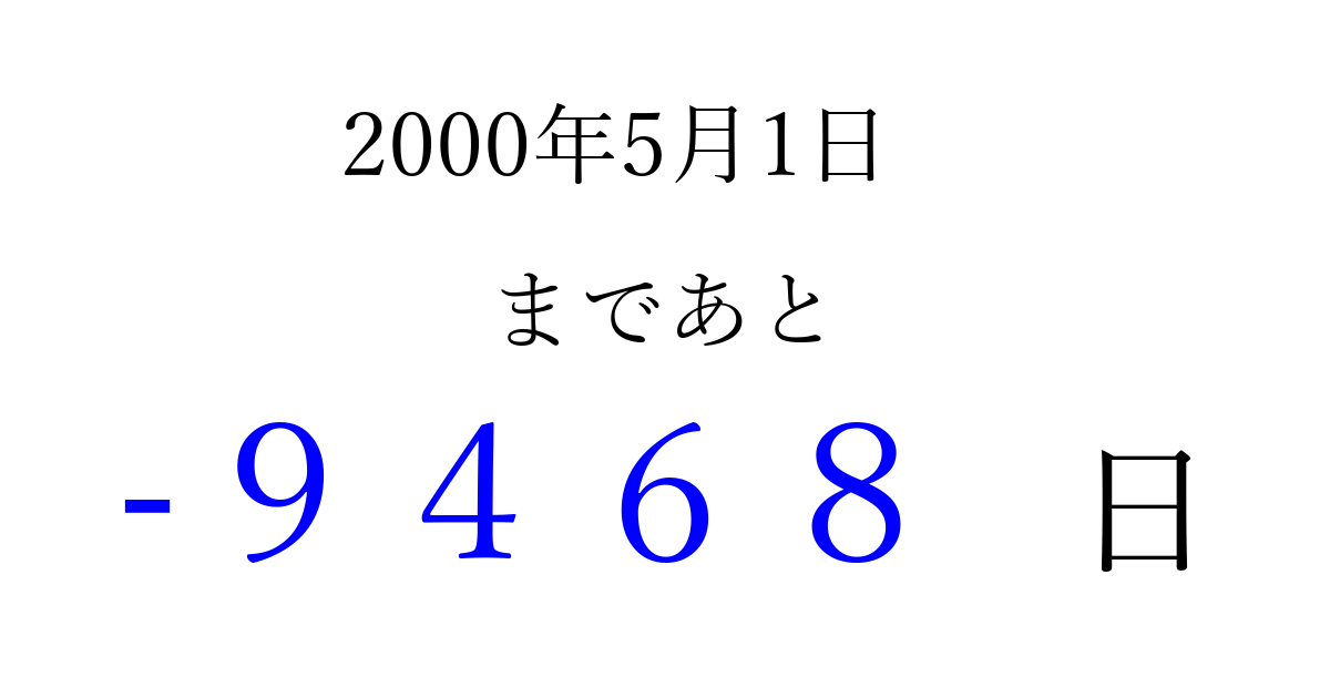 2000年5月1日(月)は もう 0000 日過ぎました 追加すると、トップページからすぐ選べるようになります ※2026/04/03現在の結果です。 最新の状態に更新する ↓シェアして、タイムライン上にカウントダウンを表示しよう!↓ 📤 この結果を共有する Tweet シェア Threads Bluesky 別の日付でカウントダウン 2000年5月のカレンダー このページをブックマークに追加すると、いつでもカウントダウンを確認できます。 (PC: Ctrl+D / Mac: ⌘+D) hitome-notes.comでは以下のページも運営しています。 指定日と期間から日付を計算 | ガチャ確率計算・シミュレーション | プライバシー・ポリシー 運営者:Avocado