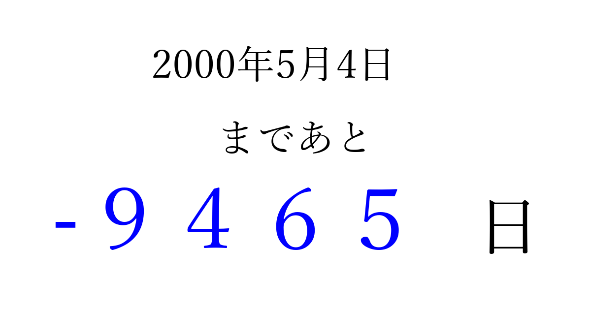 2000年5月4日(木)は もう 0000 日過ぎました 追加すると、トップページからすぐ選べるようになります ※2026/04/03現在の結果です。 最新の状態に更新する ↓シェアして、タイムライン上にカウントダウンを表示しよう!↓ 📤 この結果を共有する Tweet シェア Threads Bluesky 別の日付でカウントダウン 2000年5月のカレンダー このページをブックマークに追加すると、いつでもカウントダウンを確認できます。 (PC: Ctrl+D / Mac: ⌘+D) hitome-notes.comでは以下のページも運営しています。 指定日と期間から日付を計算 | ガチャ確率計算・シミュレーション | プライバシー・ポリシー 運営者:Avocado