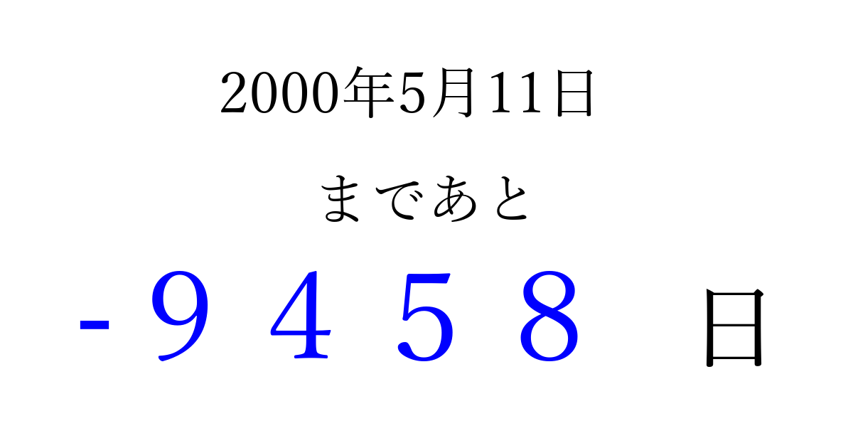 2000年5月11日(木)は もう 0000 日過ぎました 追加すると、トップページからすぐ選べるようになります ※2026/04/03現在の結果です。 最新の状態に更新する ↓シェアして、タイムライン上にカウントダウンを表示しよう!↓ 📤 この結果を共有する Tweet シェア Threads Bluesky 別の日付でカウントダウン 2000年5月のカレンダー このページをブックマークに追加すると、いつでもカウントダウンを確認できます。 (PC: Ctrl+D / Mac: ⌘+D) hitome-notes.comでは以下のページも運営しています。 指定日と期間から日付を計算 | ガチャ確率計算・シミュレーション | プライバシー・ポリシー 運営者:Avocado
